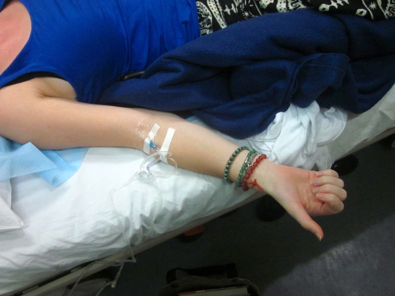 Finally - they took the blood sample and I received my first ever IV. I did NOT enjoy that. The doctor had told me it would take about 30 seconds for the needle... which was true, but I was so sick, I wasn't thinking that the IV would take a lot longer. When the nurse told me I would have the IV in my arm for 2 to 3 hours, I broke down and started crying. That's when I called friends for support.