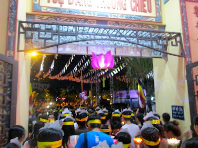 Then we all lined up, forming an aisle from the main temple doors out to the street and the river... the monks led the processional to then begin the celebration along the river... I believe the story/play acted out on stage was about the pillars of Buddhism... and one by one, the lotus lamps in the river were lit along with the narration.